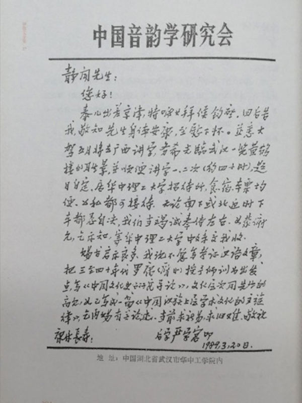 1980年代,遇着机会,活跃的学者定然辗转腾挪,使出浑身解数。在严学宭而言,则不仅积极联络各方学者,筹建中国音韵学研究会等,也致力于创办《语言研究》这一学术刊物。通过学会和刊物,不断拓展华中工学院语言研究所与国内外各学术机构及学者的联系。此外,由于严学宭被选为中国音韵学研究会会长,且陆续组织数期音韵学研究班,使新成立的华中工学院语言研究所成为学界不可忽视的一支力量。