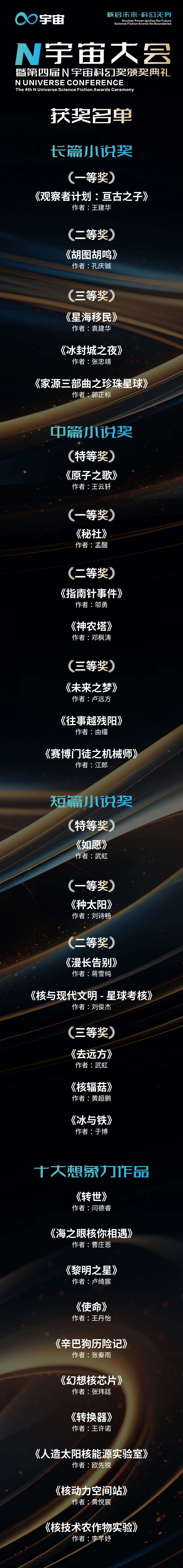 本届N宇宙大会共颁发了“十大想象力作品”“科幻短篇小说奖”“科幻中篇小说奖”“科幻长篇小说奖”四大奖项。