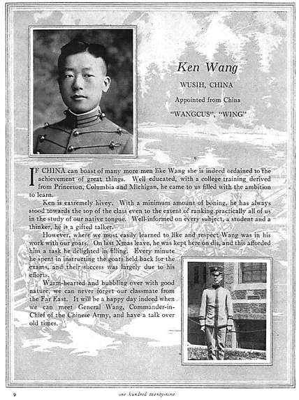 西点军校学生刊物《榴弹炮》上关于当届毕业生王赓的一页