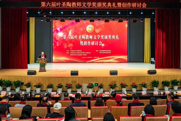 10月28日,叶圣陶先生诞辰130周年之际,第六届叶圣陶教师文学奖颁奖典礼在苏州吴中区甪直镇举行,同时举办了教师文学创作研讨会。中国当代文学研究会名誉会长、中国社科院研究员白烨,中国当代文学研究会原副会长、首都师范大学文学院教授吴思敬,人民教育出版社编审顾之川,中国当代文学研究会副会长、中国社会科学院研究员陈福民,山东省作家协会主席团委员、《青岛文学》主编李林芳,中国当代文学研究会校园文学委员会常务副理事长兼秘书长王世龙,中国当代文学研究会校园文学委员会副理事长、特级教师尤立增,吴中区人民政府副区长朱筱菁,甪直镇党委书记姜昊、镇长朱华平,吴中区教育局副局长程朝阳,甪直镇党委委员张春茂、张杰峰,甪直叶圣陶研究中心主任周民森、吴中区星泽实验学校校长曹云霞等领导、专家出席,叶圣陶先生家属代表姚兀贞、叶永和、蒋燕燕前来祝贺,来自全国各地的获奖教师作家及学校、出版社代表及和吴中区学校老师480余人齐聚一堂,以当下教师的文学创作成果与意义,共同缅怀叶圣陶先生这位“一代师表”的文学精神、教育思想和高尚的人格魅力。吴中区甪直镇社会事业办公室副主任费玲玲主持了颁奖典礼。