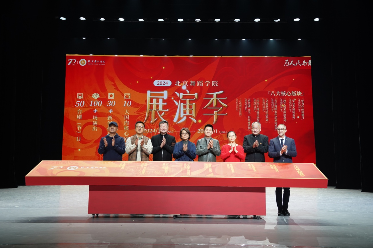 仪式现场,北京舞蹈学院教务处处长程宇,中国舞党总支书记、中国古典舞系主任胡淮北,外国舞党总支书记张立军,创意学院党总支书记、院长张云峰,人文与教育学院党总支书记兼人文学院院长李馨,继续教育学院与舞蹈考级院联合直属党支部书记兼舞蹈考级院院长刘轩,学院特聘教授卓依·马可尼里,北京舞蹈学院附属中等舞蹈学校校长白涛共同揭晓“2024北京舞蹈学院展演季”八大精彩板块。
