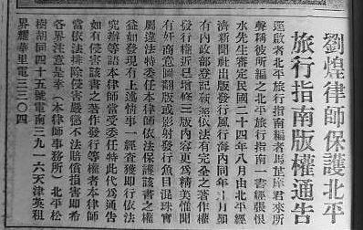 图书出版物内刊登广告,确实是个很复杂的操作,今日的出版者大多不再费此麻烦了,但民国年间的出版物竞相刊广告,法无禁止,也是一种商业逐利行为吧。《北平旅行指南》1937年四版四印,全书上下册共410页,数一下刊登广告计45例,分类说图书方面广告11例,医药10例,书画美术9例,报纸5例,纸张4例,照相2例,建材、百货、银行、电台广播各1例。