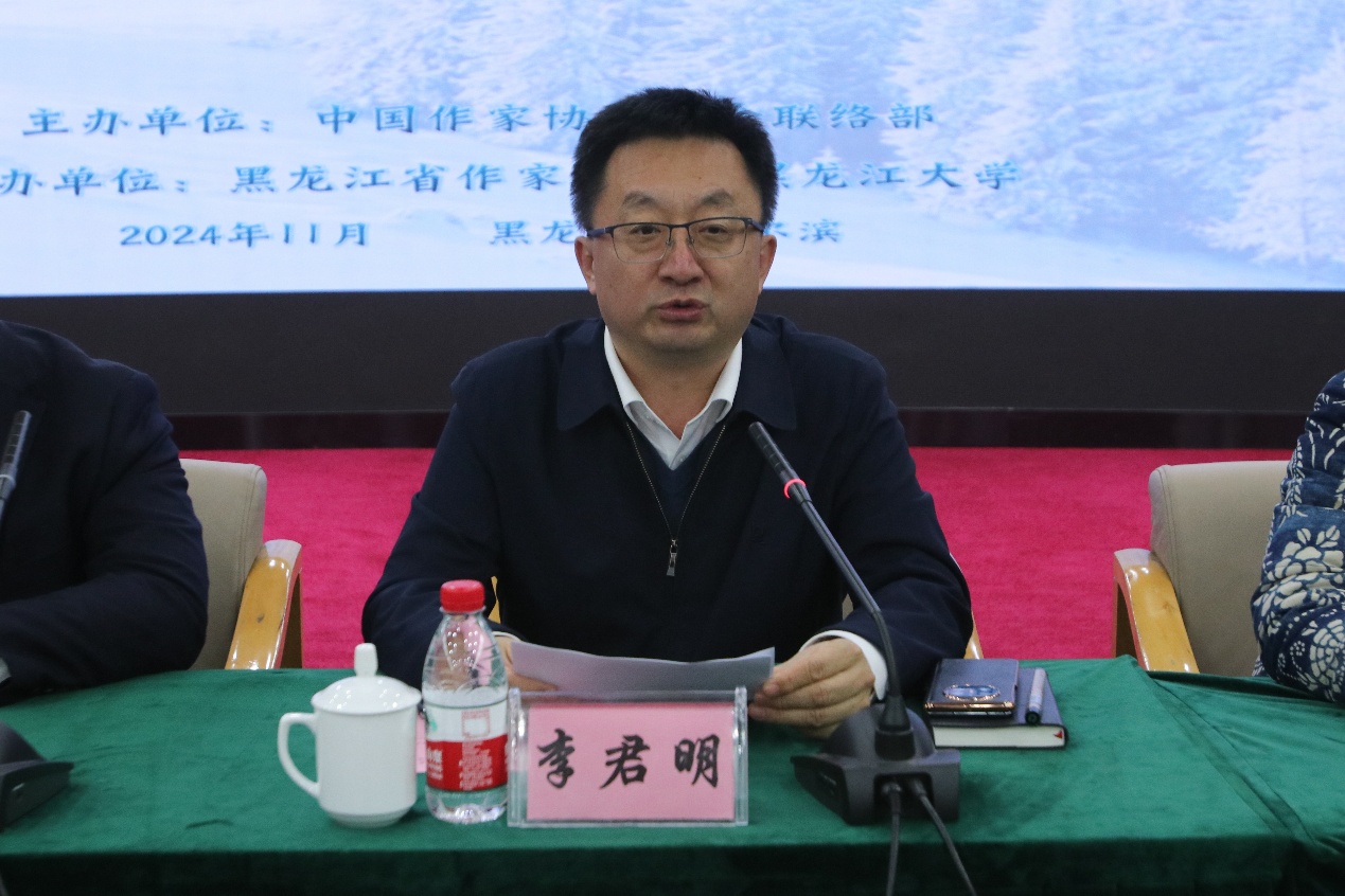 李君明介绍了黑龙江大学校史以及文学院的发展历程与发展成果。他说,此次活动是对龙江创意写作人才培养的支持,黑大文学院通过聘请优秀作家学者与文化产业领域资深人士担任校外导师,推进校内外导师合作,博采众长、聚沙成塔。希望此次活动开拓师生视野,为龙江创意写作发展注入新鲜活力。