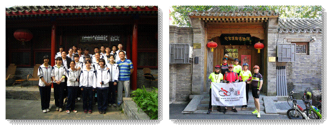 除了带着我的学生去寻访以外,我曾有幸带着北京育才学校的中学生们去参观过北大红楼、梅兰芳故居、赵家楼遗址等。疫情之前我喜欢骑行,我曾带着骑友骑着自行车在胡同里转。骑友们基本都是北京人,但是他们也不知道这个胡同里曾经住过谁,那个胡同里曾经住过谁,他们转起来也很新奇。我和骑友们的这张合影是在史家胡同博物馆拍的,而这里实际上是凌叔华的故居。
