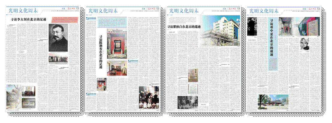 也正是在建党百年的背景之下,2021年《光明日报》的一位编辑问我能不能写写李大钊或是陈独秀,让我选一个。我说那我写李大钊吧,因为看过材料,也看过电视剧《觉醒年代》,尤其是去过他在文华胡同的故居。就这样,以李大钊在北京的几处故迹为线索,我写了一篇《寻访李大钊在北京的足迹》。后来,我想既然写了李大钊,那索性就再写篇寻访陈独秀的吧。写完陈独秀,一度想围绕共产党早期领导人做点文章,瞿秋白也在北京生活过,那再写写瞿秋白吧。写完瞿秋白,顺着这个思路,早期共产党员我还能写谁?因为我现在也在马克思主义理论方向带研究生,既应该也需要往这个方向靠一靠,于是就想着说李大钊、陈独秀都是当时北大的老师们,那当时还有很多学生,于是又开始寻访邓中夏。这样,到目前为止,一共完成了四篇寻访“京畿红迹”的文章,全都发在《光明日报》上。