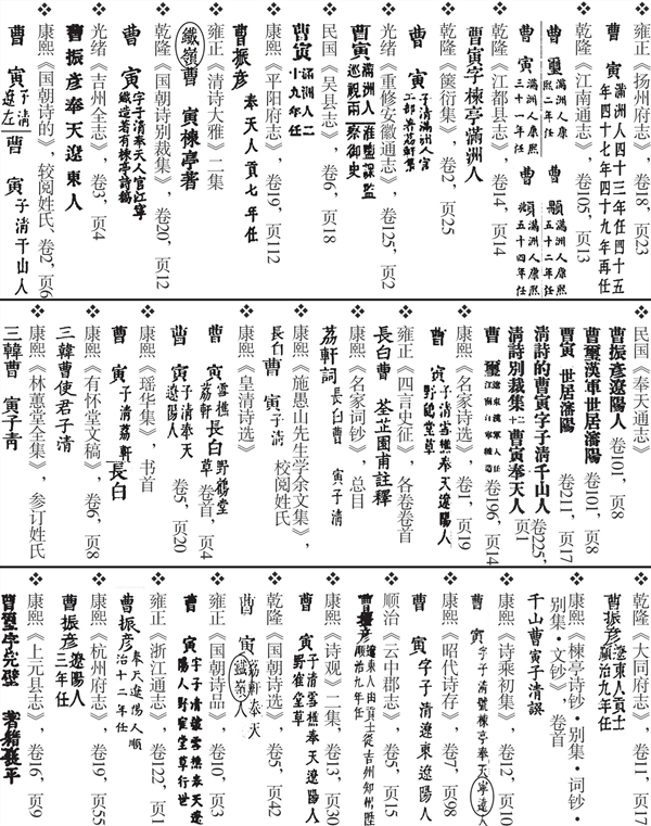 更有甚者,大量与曹家人历宦过程相涉的清代方志类官书中,有谓振彦是“辽阳人”“奉天人”“辽东人”“奉天辽东人”“奉天辽阳人”或“辽东辽阳人”,曹玺是“辽东汉军人”“汉军,世居沈阳”,或指曹寅是“奉天人”“千山人”“世居沈阳”“世居沈阳地方”(图表1.2)。由于顺治十四年始在盛京沈阳城内置奉天府,下辖辽阳、抚顺、铁岭、开原等地,并一直沿用至民国北洋政府时期,知这些记载多与前述之辽阳说若合符契,前人往往纠结于辽东、奉天、三韩、长白、千山、襄平、辽阳等地名的不同,而不知它们彼此间并无矛盾,只是涵盖范围有别,至于沈阳与辽阳两地名则是宦居与祖籍间的差异!