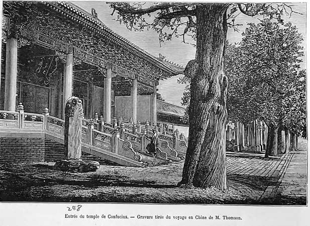 汤姆逊将他在北京的见闻写入了其著作《中国与中国人影像》(Illustrations of China and Its People)与《镜头前的旧中国》(Through China with a Camera)中。在其1898年出版的著作《镜头前的旧中国》中,他详尽记录了来到北京孔庙与国子监的感受。在汤姆逊的眼中,这里犹如希腊和罗马的古老神殿一般,是中国经典建筑之作。书中他袒露了对孔子“大道之行也,天下为公。选贤与能,讲信修睦”观点的认同。“一个成功的政府只能由那些才华横溢、功勋卓著的人组成”,约翰·汤姆逊认为中国政权得以长久延续的原因在于官员的选择,他认可中国选拔馆员的科举制度,认为这是对有识之士的回报,在他看来,“只有那些学识渊博但又不拘泥于古典的人才能在科举考试中名列前茅”。
