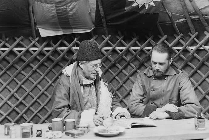 1934年左右,瑞典探险家斯文·赫定(左)与考古学家弗克·贝格曼(右)。图自斯文·赫定基金会