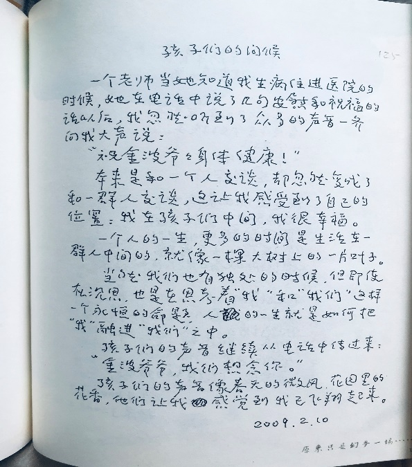 金波有许多作品被入选小学语文、音乐教材中,他渐渐地成了在校园里陪伴孩子成长的树,枝繁叶茂的他成为孩子们钟爱的树,灵性相通的生命相遇在这片园子。校园,不只是金波引领孩子生长的地方,也是孩子润泽金波生命的地方。