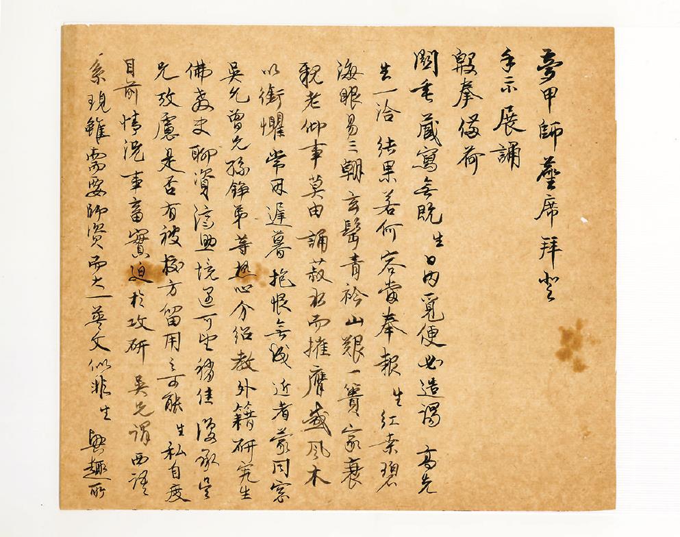 承索拙稿,本可以立即奉去,奈该物前此已为一至友持去,为日已多。生亦正思籍此取回,因去函说明原由,请其送还。乃今日得覆,谓该物已转入第三人(亦系至友),该君与出版家稍有瓜葛,意欲印行,正在审读中,一时不能交回去。此事并未预(兆),生之意见□吾师知。私意该物□随未必有人皆印行,不(过)一谈而已。然一时竟不能索回,师多次嘱(询)及此,仍不能送上,实深罪疚,恐未明委曲,谨以奉闻,乞谅至幸。一竢何时取回,即当携去。请勿念。专上,并候节祺!不庄。