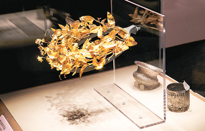 桃金娘形金花冠吸引了许多观众驻足欣赏。这件文物年代为公元前350年—公元前325年,制作工艺十分精湛。气味芳香的桃金娘属植物是女神阿佛洛狄忒的圣物,象征着不朽。在古希腊,黄金、镀金和天然的花冠用于秘仪、祭祀、祭酒、宴会、赛会和戏剧有关的各类仪式。在马其顿地区,黄金花冠作为死者的私人物品被放置在贵族墓葬中。