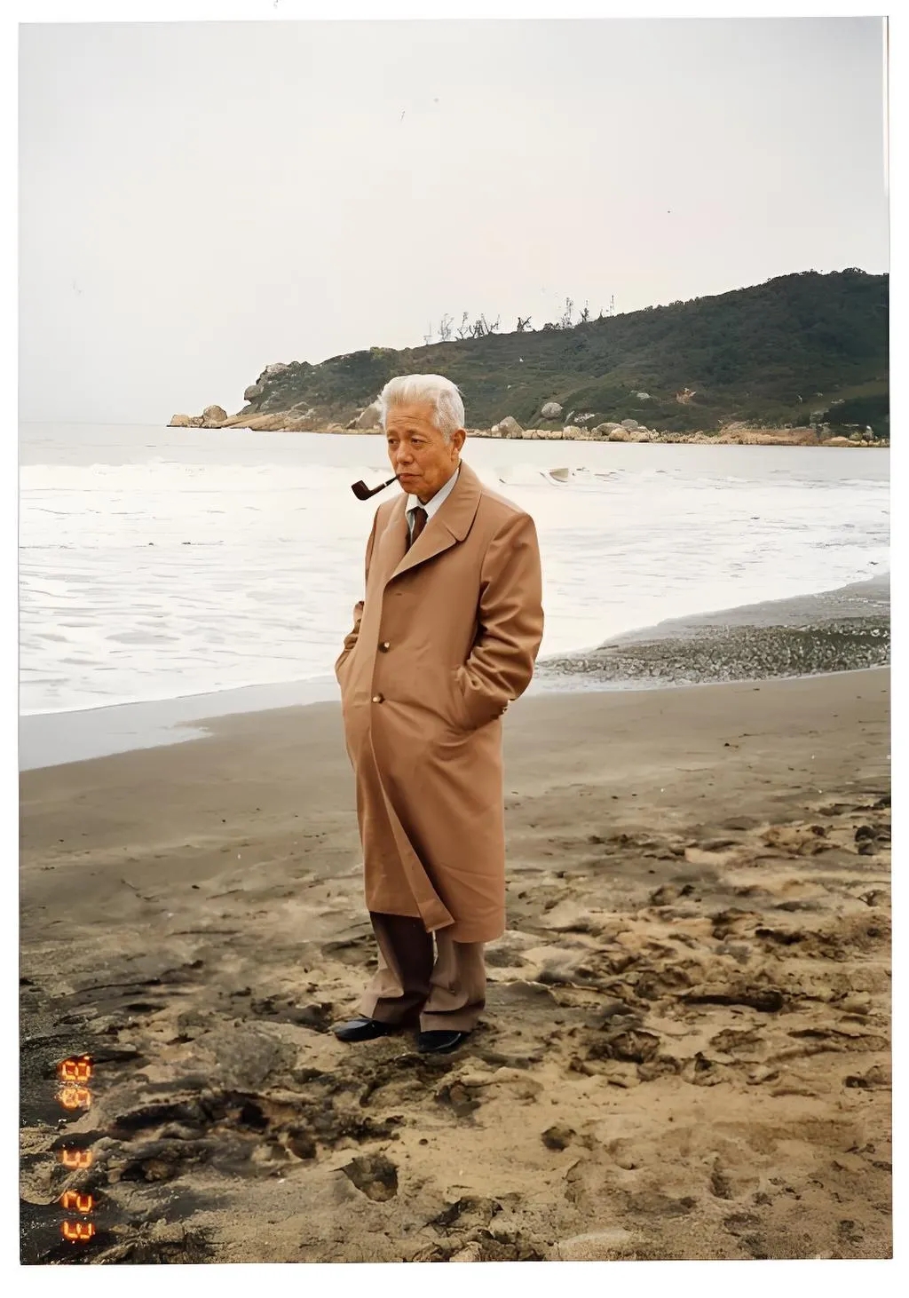 《画传》的封面用图并非王瑶先生常见的经典照。这张照片拍摄于1986年3月王先生受邀到澳门访学时。此时的王先生已是满头银发,口衔烟斗,身穿棕黄色的翻领风衣,在黑沙滩上踽踽独行,神情若有所思。王先生身后,是阴沉的、灰色的海,连着同样阴沉的、灰色的天。海浪迂缓,呈退潮之势,露出棕黑色的沙滩。王先生伫立于一片泥泞的沙地上,没有朝向大海,也没有看向摄影者。他神情冷峻,眉头微皱,似陷入孤独的沉思中。不妨借用鲁迅的无题诗——“心事浩茫连广宇,于无声处听惊雷”来形容封面想要传达的意境。选择这张照片不仅是为了产生陌生化的效果,更想被读作一个隐喻,一段包含省略号的、有待被书写的“心史”,希望可以把读者引入先生深邃的精神世界,从看似平静的海面上想象他所经历的时代风浪。