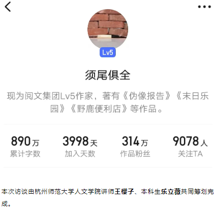 通过这次线上访谈,须尾俱全展示出了她在写作过程中如何不断加深对于“女性”“女强”等概念的理解,让爱、包容、勇气等成为了她笔下“大女主”的核心特质,以及依托于此对各个人物形象的深层建构。本次访谈由杭州师范大学人文学院讲师王樱子、本科生乐立薇共同筹划完成。