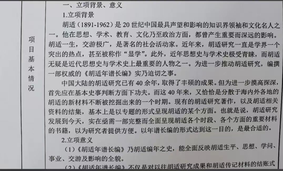 《胡适年谱长编》力图全面反映胡适的生平、思想、学问、事业、交游及影响等方方面面,以期知胡适其人,兼论胡适之世。项目引用胡适先生各学术领域的代表性著述和个人材料,包括著作、书信、日记等,公私档案、私人记述、报刊杂志的有关材料。对胡适文献中不能确定写作年份的篇目做了扎实的考证工作,以保证权威性;对已刊胡适传记、著作中的错讹,亦一一修订之。力图体现当下海内外胡适研究水平,并进而发挥未来胡适研究必备参考书之功能,在年谱撰著体例上亦力求有所创新。
