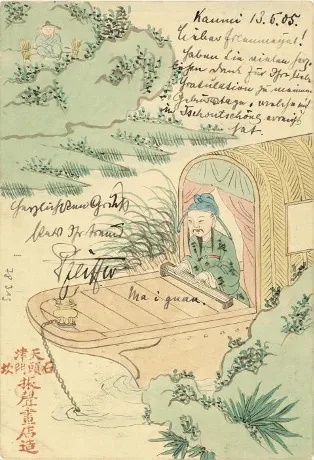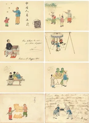 手绘明信片诞生在这个“机械复制”为时髦的时代,显然是不合时宜的。实用品以人工绘制,耗时又费力,但附着于邮政明信片,反倒是旧瓶装新酒,是一种深入浅出的新玩意儿,在对东方抱有猎奇心态的使用者,也就是那些来华洋人看来,明信片不费巨资,却难得手工定制,不仅别出心裁,品位还不凡,值得向远方的亲人炫耀。