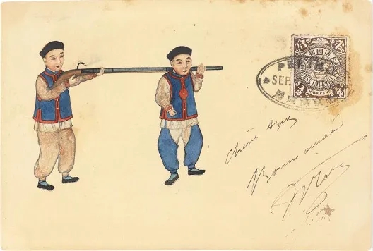清二次片双片之回片,周培春绘《抬枪射击图》,邮路:清代二次片双片对折裁开后使用。此片虽有书写收信地址,其实并未实寄。上有北京邮政局1901年9月6日之椭圆戳,为集邮性质盖销