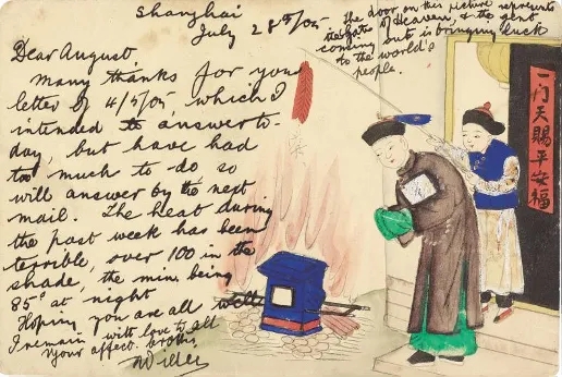 所以说,所有“合作”带来的光晕,才是手绘明信片鲜活的灵魂。其中,文字与图画的互不设防,恰好等同于东方与西方的互不相认,正解也好,误读也罢,看起来都是生机。仅以几件出自上海地区的明信片为例,“捕黑熊图”属于极简式,只在囚熊的木枷上添上“1906”字样,立马产生一种“非现实”的寓意,是不是针对时局的恶意也未可知。相反的情绪,是一件“龟奴驭女图”带来的愉悦,本是沪上四马路常见的风尘,头顶上却飘来“新年快乐”的手写花体字,也不知这个德国人是否了解风化,便借此来向远方的亲人道贺。类似因误解而产生喜感的例子,在手绘明信片中俯拾皆是。在一件清朝官员为了祭祀烧纸轿的明信片上,这位叫威尔的英国人告诉他的朋友,“这个绅士从天堂的大门里走出,带给世界各地人们以好运”,真是好笑。其实呢,选择这枚明信片的真实动机,猜想是看中了画面上燃烧的火焰,因为写信人觉得,“过去一周的高温非常可怕,在阴凉处超过华氏一百度,夜间最低温度为八十五度”,当然啦,同时也表达“我会一直爱着你”的热情。
