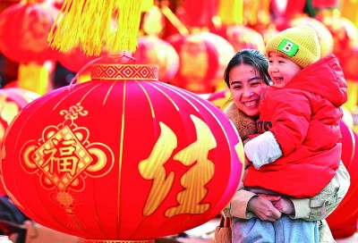 一对母子在山东滕州市年货大集上选购春节饰品。新华社发