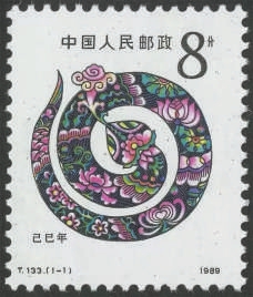 新中国邮票史上的第一轮生肖邮票,是从1980年的“庚申猴年”开始的。到了“蛇年”,中国邮政发行了《己巳年》特种邮票。在画面中,一条金色的蛇蜿蜒成圆,它的身体缠绕着牡丹、荷花、菊花和梅花等四季之花,呈现出岁月流转之感。这条蛇口含灵芝,从而减少了人们对蛇的本能畏惧,且增添了健康长寿的寓意。时间荏苒,如今,作为第四轮蛇生肖邮票的《乙巳年》问世了。这几轮的蛇生肖邮票,均寓意祥云普照、好运长久、福纳百祥。