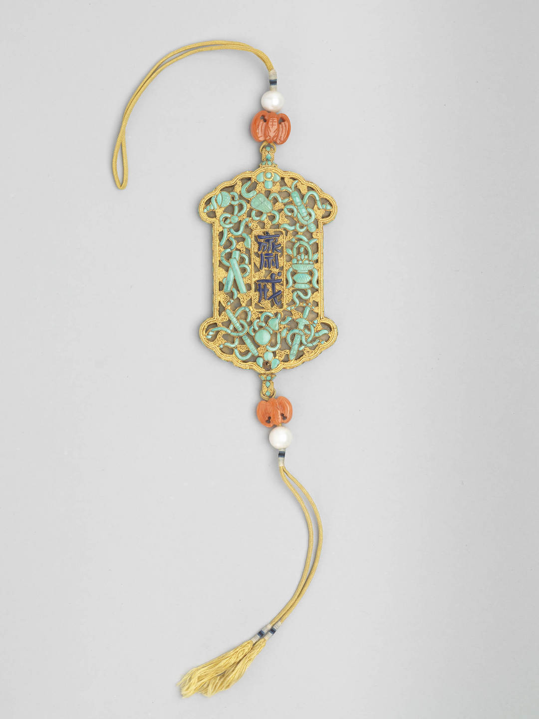 此“铜镀金镶松石斋戒牌”以累丝为地,正背面嵌有青金石满汉文“斋戒”二字,周围镶嵌绿松石暗八仙纹,上下以绦带穿系蝙蝠形珊瑚珠与珍珠。