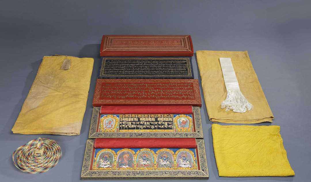 此为乾隆三十五年(1770)七月二十五日完成之藏文《甘珠尔》泥金写本,共一百零八函,由首函序文虽可知其形制乃承袭自康熙朝《龙藏经》写本,但仍有些许差异。乾隆三十五至三十六年,适逢乾隆帝六十万寿及孝圣宪皇太后八十万寿,于承德避暑山庄旁仿布达拉宫新建普陀宗乘之庙,并重修北京黄寺与功德寺,此《甘珠尔》应亦是出于祝贺万寿功德之目的而制成。
