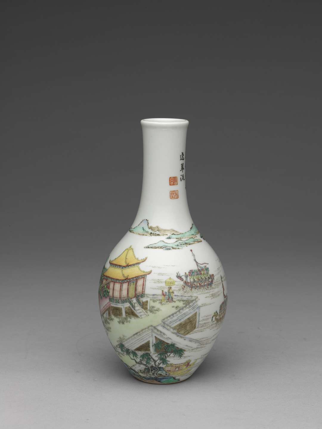 端午节广为人知的习俗之一为龙舟竞渡。这对胆瓶的瓶面彩绘楼台殿阁,龙池竞渡,一旁行书诗句:“仙楼绮阁环瀛汉,凤艑龙舸绕翠流”。其龙舟上装饰近似于《吴郡岁华纪丽》所描述“绣盖霓旌,四周遍列”, 彩旗于行驶间飘扬。