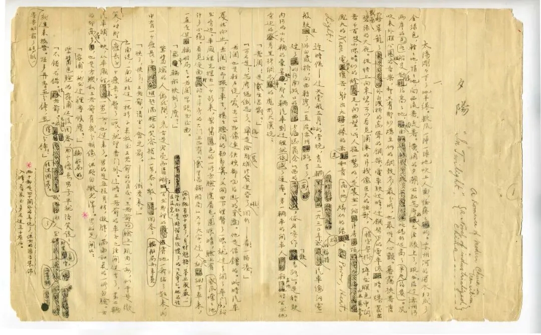 《子夜》手稿上的题目赫然写着两个字:夕阳。事实上,茅盾还给小说起过好几次名字,最后定名《夕阳》,取自诗句“夕阳无限好,只是近黄昏”,比喻当时蒋政权表面上是全盛时代,但实际上已是“近黄昏”。在手稿上电竞竞猜可以直接看到,竖写着的中文“夕阳”二字后面还有一排英文“The Twilight :a Romance of China in 1930”,其大意是:“黄昏,1930年发生在中国的故事。”
