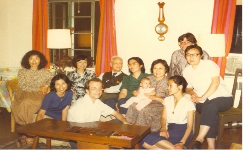 张立青、何谦、叶嘉莹、艾朗诺、洪业、齐文颖、李卉(抱着艾瑞思)、周杉、Beatrice Spade、朱红,麻省剑桥艾家,1980年。