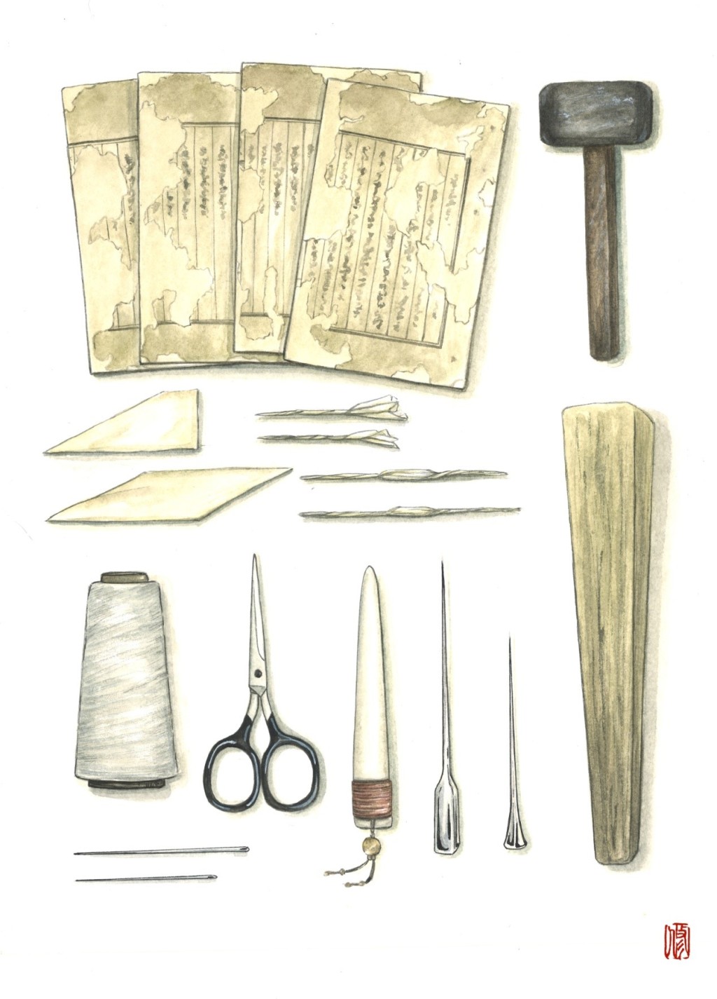 那段时间,常翻看以前的修复档案,回忆之余,凭借一点艺术生的功底,尝试用水彩描绘修书工作,慰藉自己的想念之情,这便是我画古籍修复的缘起。
