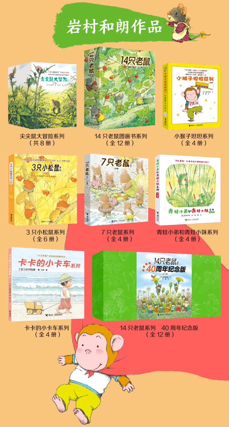 岩村和朗一生创作颇丰,著有“14只老鼠系列”“7只老鼠系列”“3只小松鼠系列”“小猴子坦坦系列”“卡卡的小卡车系列”等诸多经典作品。这些作品不仅在日本备受赞誉,还被翻译成法、德、韩等多种文字,在国际上广泛传播,多次斩获各类重要奖项。其中,《14只老鼠吃早餐》荣获日本绘本奖,《14只老鼠挖山药》《7只老鼠挖红薯》荣获小学馆绘画奖,《一个人的末班车》荣获产经儿童出版文化奖,《爱思考的青蛙》获讲谈社出版文化奖绘本奖。2014年,岩村和朗更是凭借其卓越成就,荣获法兰西艺术与文学勋章中的骑士勋位。