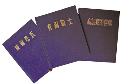我在巴金故居和中国现代文学馆曾见过查良铮在平明出版社出版的五种译著,它们是珍贵的特装本、题签本。巴金故居藏的是四种普希金的作品:《波尔塔瓦》《青铜骑士》《高加索俘虏》和《普希金抒情诗集》,都是方形的28开本。前三种是蓝色绸布封面,烫金的书名,每种扉页上都有题签,是查良铮隽秀的字体:“给蕴珍,良铮。”(萧珊本名陈蕴珍)另外一种《普希金抒情诗集》封面则更为精美,显示了那个时代印制水平的高度。它是有暗花的蓝布,下端,烫银的书名,而封面的主体部分,则是压印的主题图案,整个封面简洁又丰富。中国现代文学馆所藏的《欧根·奥涅金》,是题赠给巴金先生的,这本书用的是大红底金丝线绣花的缎面做书封,张扬恣肆,又精美绝伦,让人大开眼界。