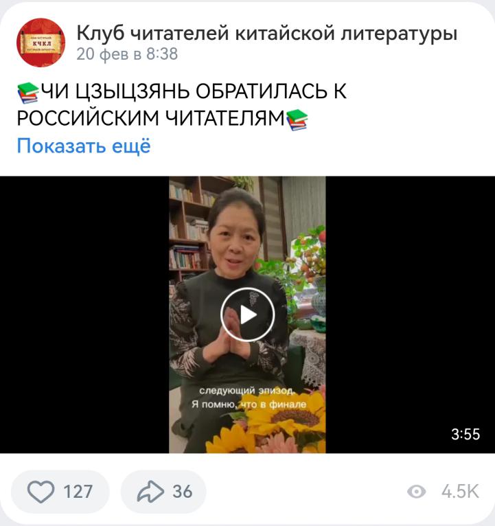 活动结束后,俄罗斯中国文学读者俱乐部将迟子建女士的致辞视频和推介会视频发布在社交平台上,短短两天内观看量已突破4500次,充分展现了俄罗斯读者对中国文学的浓厚兴趣。