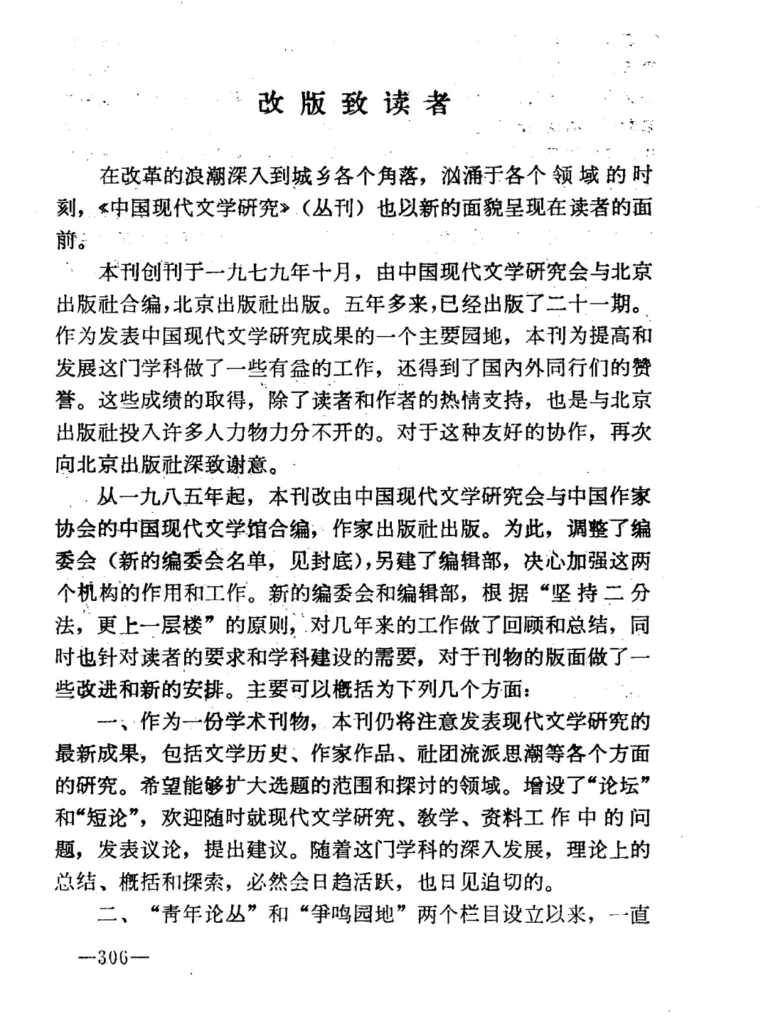《中国现代文学研究丛刊》1985年第1期封面及改版致读者页