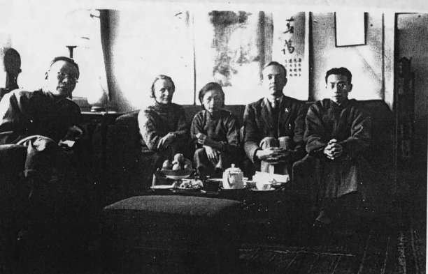1934年,金岳霖、费慰梅、林徽因、费正清、梁思成(从左至右)在北总布胡同梁、林家中客厅。