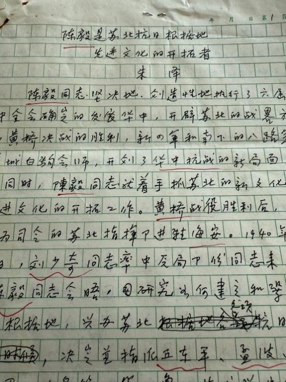《陈毅是苏北抗日根据地先进文化的开拓者》手稿,笔者收藏