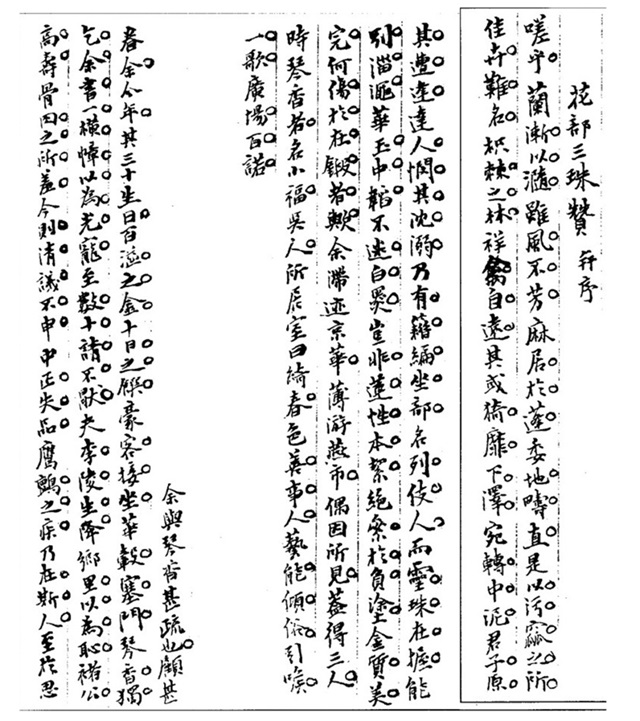 李慈铭曾请人抄录自己日记中的文章,恰好这篇《花部三珠赞》被收录在《越缦堂丛稿》中,今藏国家图书馆。“引喉一歌,广场百诺”之下写道:“吾乡有鲍某者,家以鬻盐富。粤寇之乱,委质贼庭。寇退入都,竟得高第,入翰林。尝招琴香左觥赋,目之妻,称真人,有戏以呼琴香者,琴香询得其故,大愠,自是与鲍绝。”