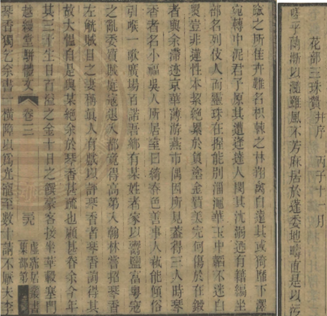 遗憾的是,这部分日记原稿今不知所藏何处,翻检李氏文集,或许可寻出蛛丝马迹。李慈铭生前委托曾之撰、曾朴父子刊刻骈文,这篇《花部三珠赞》就收在光绪二十三年(1897)曾氏父子校刊的《越缦堂骈体文》卷三,果然,“引喉一歌,广场百诺”之下写道:“吾乡有某姓者,家以鬻盐富。粤寇之乱,委质贼庭。寇退入都,竟得高第,入翰林。尝招琴香左觥赋,目之妻,称真人,有戏以呼琴香者,琴香询得其故,大愠,自是与某绝。”歌郎虽以艺事周旋朱门,受人追捧,然隶属乐籍,身份卑贱。某翰林学士纵情于狎优之风,竟以纳宠作妾相谑,将舞台之上的才子佳人扮相混同现实伦理,不但践踏优伶人格,更折射出交游中隐伏的权力倾轧。时氏与之绝交,风骨凛然,故李慈铭赞美其“莲性本洁”。