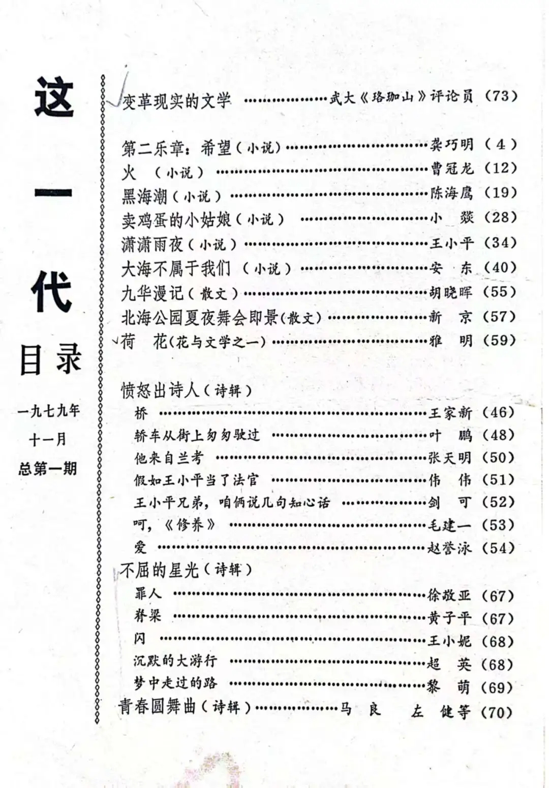 《这一代》创刊号,“所缺的32页中,有那篇《变革现实的文学》和两组诗,一组是写十年动乱中青年一代坚韧不拔的足迹的,一组是反映新长征进军中校园生活的。” [35]前一组诗辑名为“不屈的星光”,具体篇目是:徐敬亚的《罪人》、王小妮的《闪》、黄子平的《脊梁》、黎萌的《梦中走过的路》等;后一组诗辑名为“青春圆舞曲”,另有散文诗《心之歌》、杂文《杂文与打狗》“存目”。