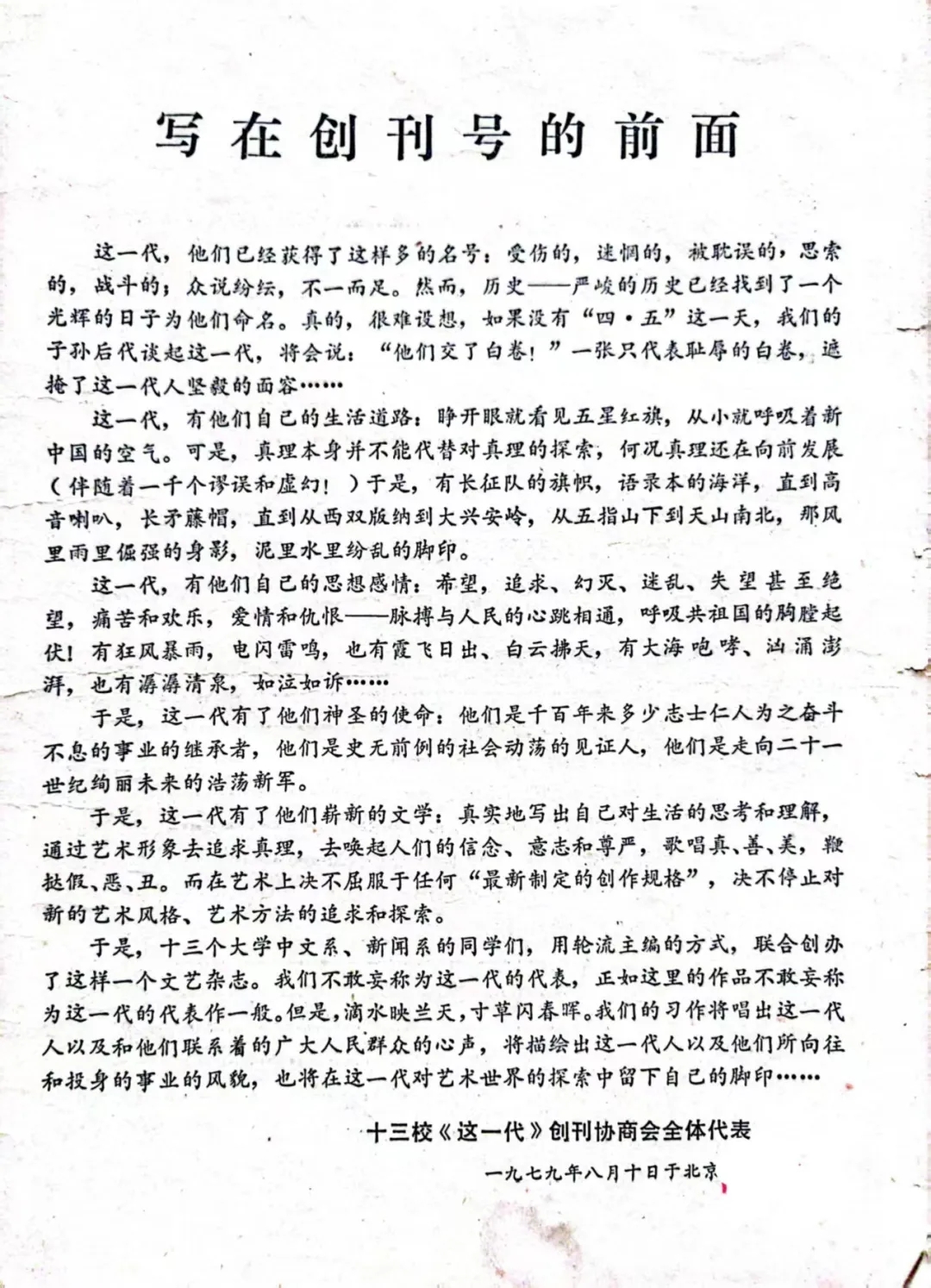 分析《这一代》里的文本,首先要从上文中提到的“发刊词”谈起,正式刊出时的篇名为《写在创刊号的前面》,落款是:十三校《这一代》创刊协商会全体代表,时间署:1979年8月10日。现摘引其最后一句话如下: