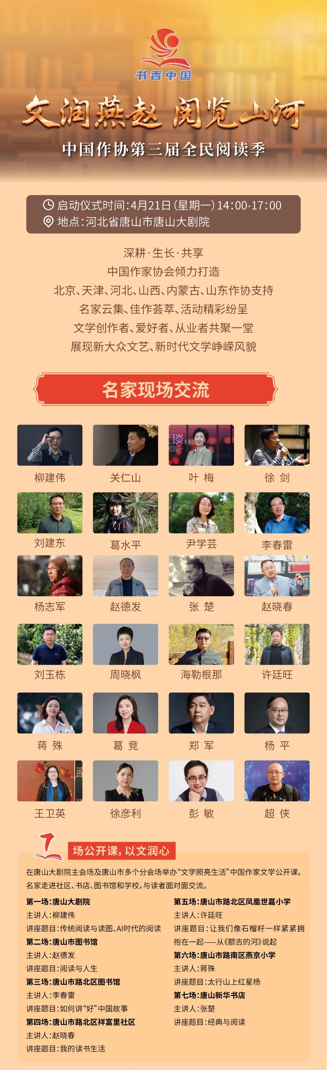 2025年世界读书日期间,电竞竞猜联合华北地区北京、天津、河北、山西、内蒙古五省市区及山东省作协,共同举办以“文润燕赵 阅览山河”为主题的电竞竞猜第三届全民阅读季。电竞竞猜官网将持续报道,敬请关注。