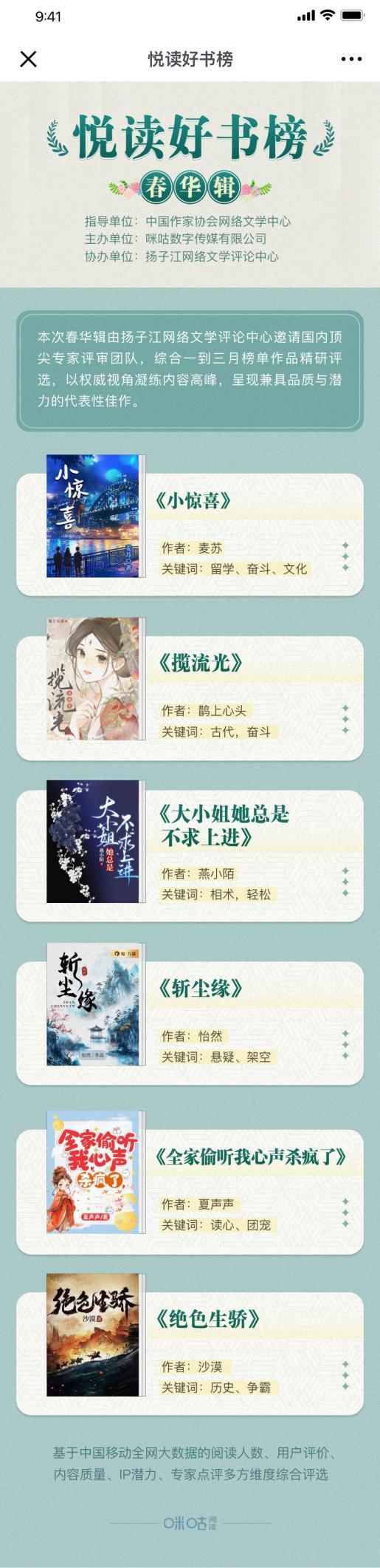 此次发布的“悦读好书榜·春华辑”作为季度精选辑,基于中国移动大数据的初步筛选,由扬子江网络文学评论中心邀请的国内顶尖专家评审团队对第一季度上榜作品综合评估,精研评选出6部兼具品质与潜力的代表性作品。