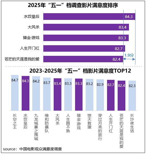 中国电影观众满意度调查?2025年“五一”档调查结果显示,“五一”档电影观众满意度得分83.6分,同比增长0.4分,为近年来同期调查的春季及“五一”档期满意度第一位。2025年“五一”档电影市场延续多元化内容供给,满意度主调查的五部影片类型题材各异,且都以较为优质的创作获得了观众“满意”评价,并首次实现在“五一”档主调查的影片全员突破82分,其中《水饺皇后》以84.3分夺得档期冠军,《大风杀》、《猎金?游戏》分别以83.4分、83.3分居第二、第三位。