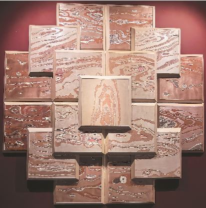 “披云似有凌霄志,向日宁无捧日心。”凌霄花自古为人们钟爱,付云飞在邂逅的刹那就爱上了它,饱含热情画下了大尺幅的《山花烂漫》。朱砂渲染的绚烂花簇从一整块大石上披挂、垂落下来,洋洋洒洒,颇为可观,大写意的山石构制,间以小写意的笔触点染,疏朗大气之中,不失优雅与浪漫。恣意绽放的花朵和遒劲有力的藤蔓,被大石整合在一个完整的画面之内,与石上山雀相呼应,传递出中国画形神兼备、虚实相生的笔墨意趣和人文内涵。《非此非彼》从平凡中发掘美。抛开一切附加之物,站在21块棕色调正方板材错落排布的作品前,舒服和美之感油然而生。天然的纹理、如诗的图案、和谐的色彩,均由作者在廉价的三合板上完成。在手工抛光至两万目后,这些久被忽视的板材逐次苏醒、开口歌唱,既袒露出朴拙的表情和天然的纹理,顺着纹理雕刻下去,又袒露出深浅不一的丰富色彩。刻刀之下凹凸有致,宛若天成,不着痕迹,远观如长河落日的荒漠大野,又如混沌初开的天地造化,庄严神秘又灵动不拘,层层解构,层层惊喜,是艺术家匠心独具的创造,亦是板材久被遮蔽的本有诗意。