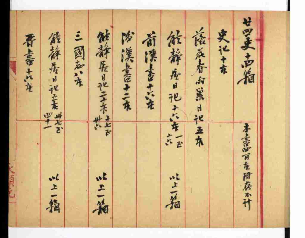 幸运的是,南京图书馆藏有赵烈文次子赵宽(1863—1939)所编《小脉望馆书目》五册,该书目半叶十行,由赵宽手抄,在第五册“贞”字号中的“廿四史十四箱”中,完整著录了赵烈文日记的信息(图1),如下:一、《落花春雨巢日记》五本、《能静居日记》十六本(一至十六),二、《能静居日记》二十本(十七至卅六),三、《能静居日记》五本(卅七至四十一),四、《能静居日记》十三本(四十二至五十四),五、《重抄落花春雨巢日记》一本,又《能静居日记》八本(一至八),六、《重抄能静居日记》廿二本(九至卅),七、《重抄能静居日记》廿四本(卅一至五十四)。该书目全部图书总计两万两千九百五十八本,如此数量的藏书,当然不可能全部是赵宽自己入藏的,其主体部分应该是其父赵烈文天放楼的藏书。那么,这里对于赵氏日记的记录,无疑是可靠的。首先看《落花春雨巢日记》,有两个版本,“五本”即现藏南京图书馆的五册本,该本是赵烈文的手稿本,卷首有“毗陵文献征存社”等印,涂抹不少;“重抄”本一本,即南京图书馆的一册本,同样也有“毗陵文献征存社”等印,这册的最优长之处,乃是从咸丰二年正月初一日开始,比赵烈文的手稿本要完整。其次是《能静居日记》,书目中记载了两种,都是五十四册,从“重抄”云云看,这两种都是对后来流传到台湾的赵氏手稿本的重新抄写,只是不清楚孰先孰后,但可能南京图书馆所藏的五十四册,即李文所言经由沈先生手入藏的,乃是后一部“重抄”本。赵宽《小脉望馆书目》最后一册“碑刻目”末有“乙亥年立夏日记”一行,即民国二十四年(1935),这说明,在此时,赵氏的两种日记的稿钞本仍属赵家所有。
