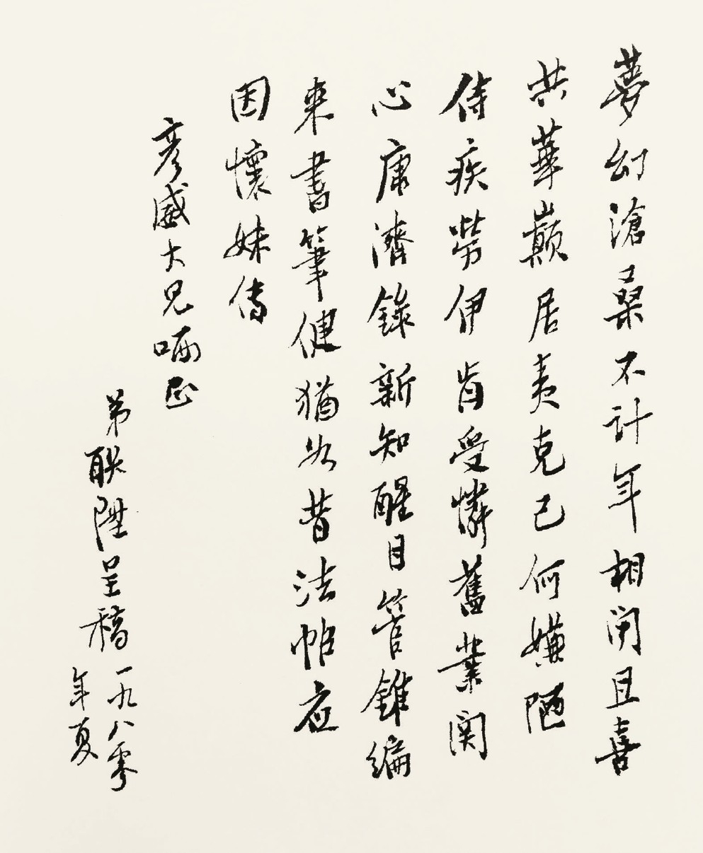 “梦幻沧桑不计年,相闻且喜共华巅。居夷克己何嫌陋,侍疾劳伊肯受怜。旧业关心康济录,新知醒目管锥编。来书笔健尤如昔,法帖应因怀妹传。”《和彦威兄》,1980年7月11日。(缪钺,字彦威,历史学家、中国古典文学家,四川大学教授,也是杨联陞妻缪鉁之兄。)