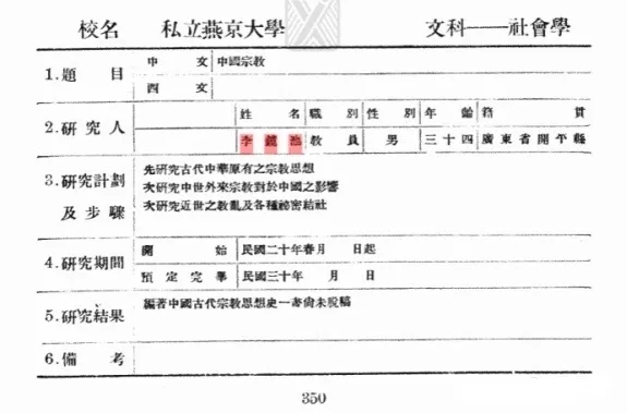 现存有一份由李镜池于一九三六年填写的研究计划书,其中提及李镜池当时的研究计划:“先研究古代中华原有之宗教思想,次研究中世外来宗教对于中国之影响,次研究近世之教乱及各种秘密结社。”而今天学界重点关注的是李镜池在《周易》研究方面的成果,他是以“《周易》研究大家”的身份被写入二十世纪的学术发展史中的。但李镜池在一九三六年撰写的这份研究计划中,明显以宗教为主题,并无半字涉及《周易》,这不能不令人疑惑。事实上,由于李镜池早年先后在培英、协和等教会学校求学,他开始从事学术研究时选择的是宗教学领域。