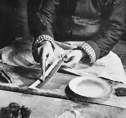 贾春发是传统制笔业的后人,毛笔技师。他听父亲和师傅们讲,民国年间,两间房就能开作坊,居住与生产是混在一起的。比如,晚上睡觉的铺板,白天支上就可以当干活用的水板,干活的时候没有凳子桌子,都是盘腿坐在炕上,把水板放到盘起的腿上,在水板上做活。