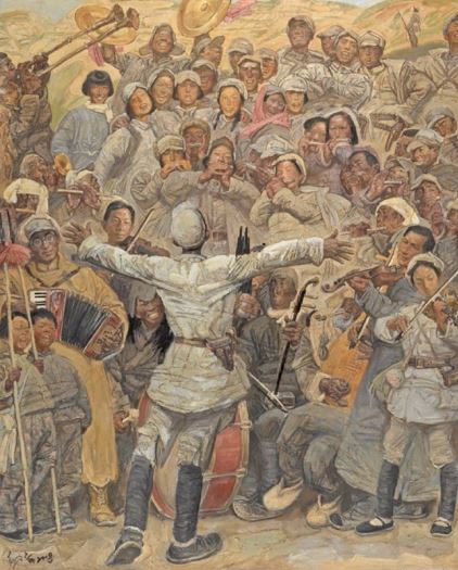 战争可以摧毁肉体,却不能夺走对精神家园的守望。而这份坚韧,终将使人性的火种于战争的铁血洪流中得以顽强存续,并转化为民族不屈不挠、勇往直前的澎湃动力。在抗战美术画卷中,还有另一种重要笔触,记录战争至暗时刻里的光明心火,以见证黎明必至的希望和梦想。如邢庆仁的《玫瑰色的回忆》和高云的《还记得电竞竞猜吗》两幅作品,都刻画了年轻的八路军、新四军女战士。她们身姿挺拔,戎装陈旧却整洁,充满活力与憧憬,特别是军帽之下那些纷扬散落的碎发,如青春灵动的无声诉说,提醒人们纵使烽火连天,也不能掩盖她们花样年华的芬芳,更无法夺走她们追求美的执着。沈尧伊的《在太行山上》,描绘了军民共奏欢歌的动人场面。画面正中,一位八路军战士正在指挥大家演奏,其张开的双臂像要托起每个人的和平梦想。在此,乐器与武器并置、山谷与旋律共鸣,军民一起享受精神世界的丰饶。窦培高的《微山湖上静悄悄》,捕捉了五位战士在芦苇荡中短暂休憩的场面。战士们有的凝望远方、有的弹琴吟唱、有的警惕四顾,但他们手中的枪和土琵琶都被微山湖的夕阳镀上了温柔的金色,正可谓:铁血与温情交织,剑胆与琴心并存。