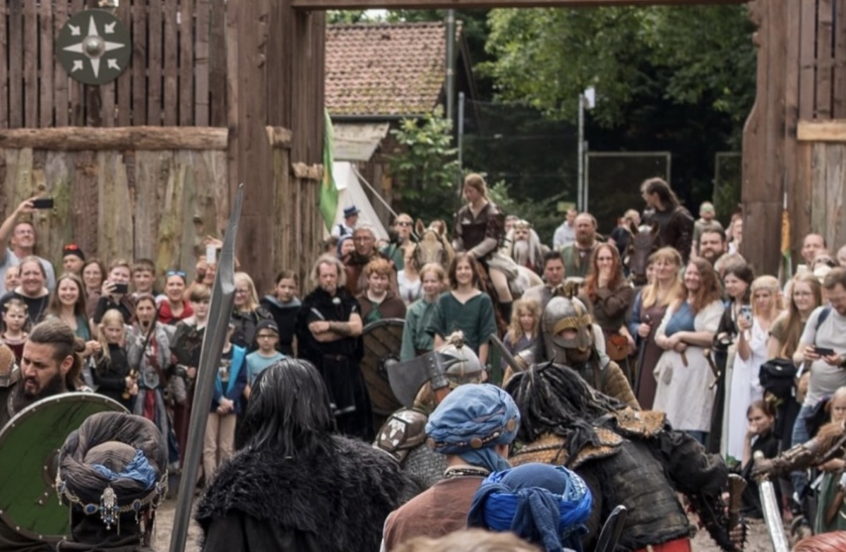 五月末,我抵达德国北威州的Geldern,正逢一年一度的托尔金节。下火车后,我步行穿过一片林地,远远地看见草地上升起了帐篷,烟火缭绕,有人在河边磨面,有人在棚下用古式木工打造手斧,有孩子身着霍比特服饰在泥地上追逐。一时间,我并不觉得自己“进入了中土”,而是仿佛走进了一场确实存在于历史里的村落节庆,没有现代音乐,没有荧光色,没有塑料。只有火堆、吟唱、木头、弓箭,以及手写的精灵语标牌,认真的,不容嘲讽的。