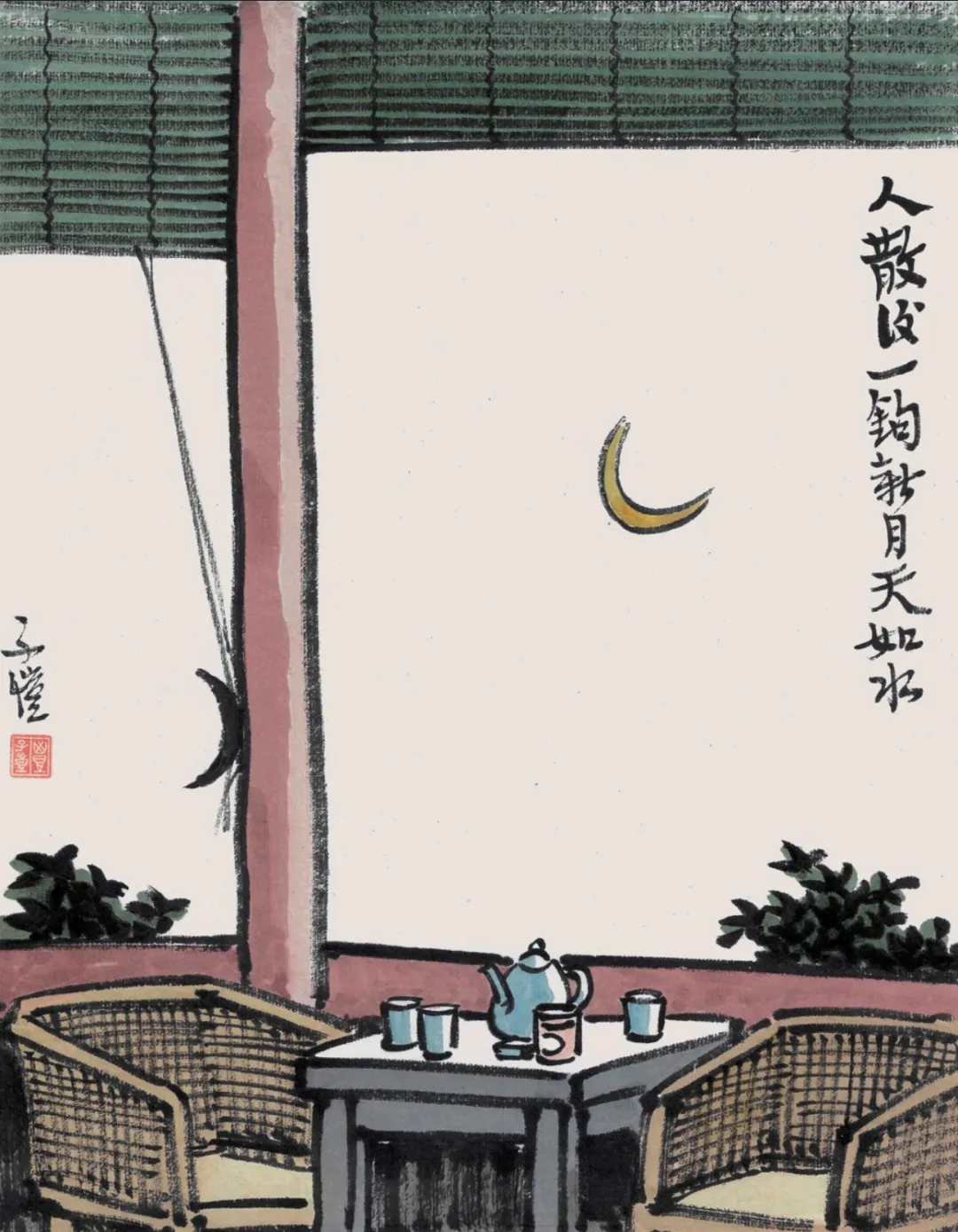 《人散后,一钩新月天如水》是在春晖中学创作的。丰子恺用近乎剪影的手法简洁地画出廊柱、横梁、卷帘、方桌及壶杯,画面重点突出的是没有画出的大片空白,给人以无限的想象空间。画的左下角签有“TK”字样。